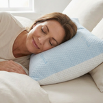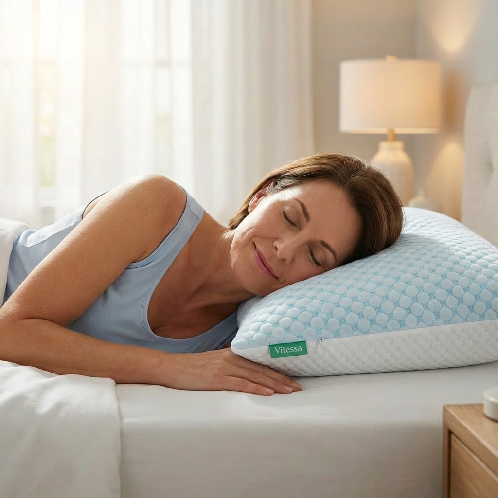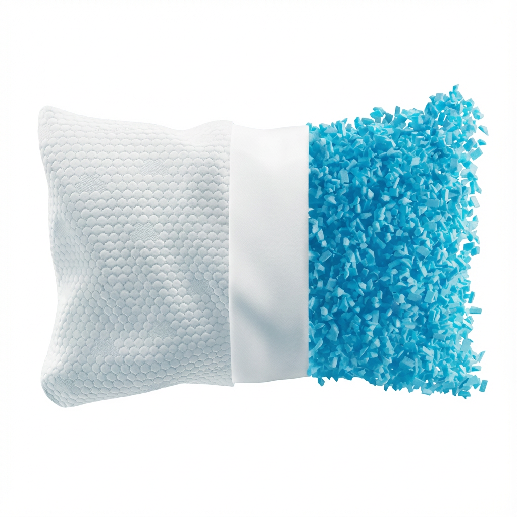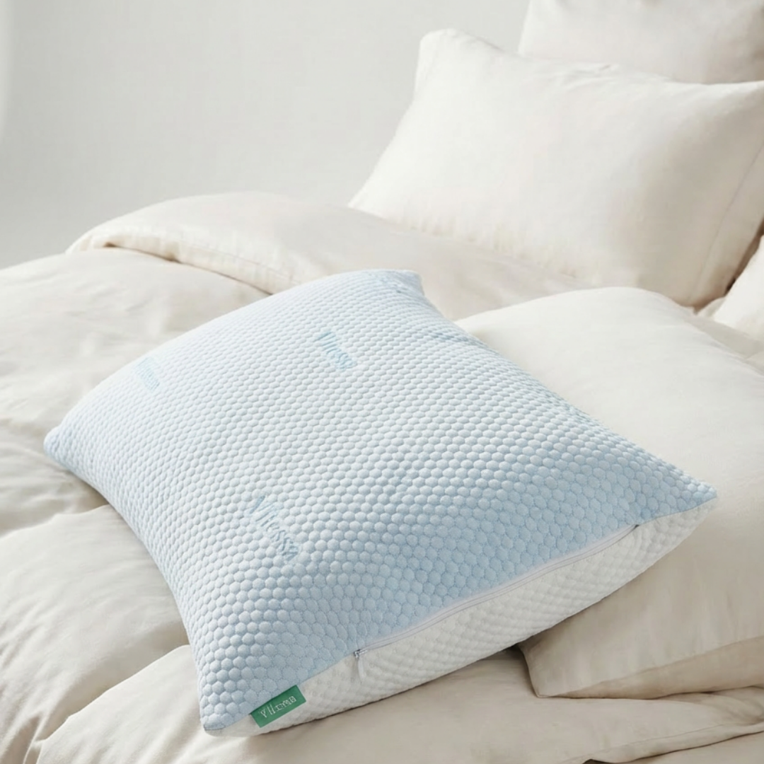 The blue cooling side of the Vitessa pillow is made with a cool-to-the-touch fabric that draws heat away instantly. Combined with the breathable shredded foam that allows continuous airflow, it helps maintain a comfortably cool sleep surface throughout the night, not just at first contact.