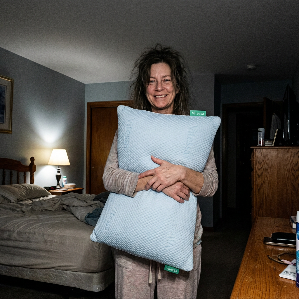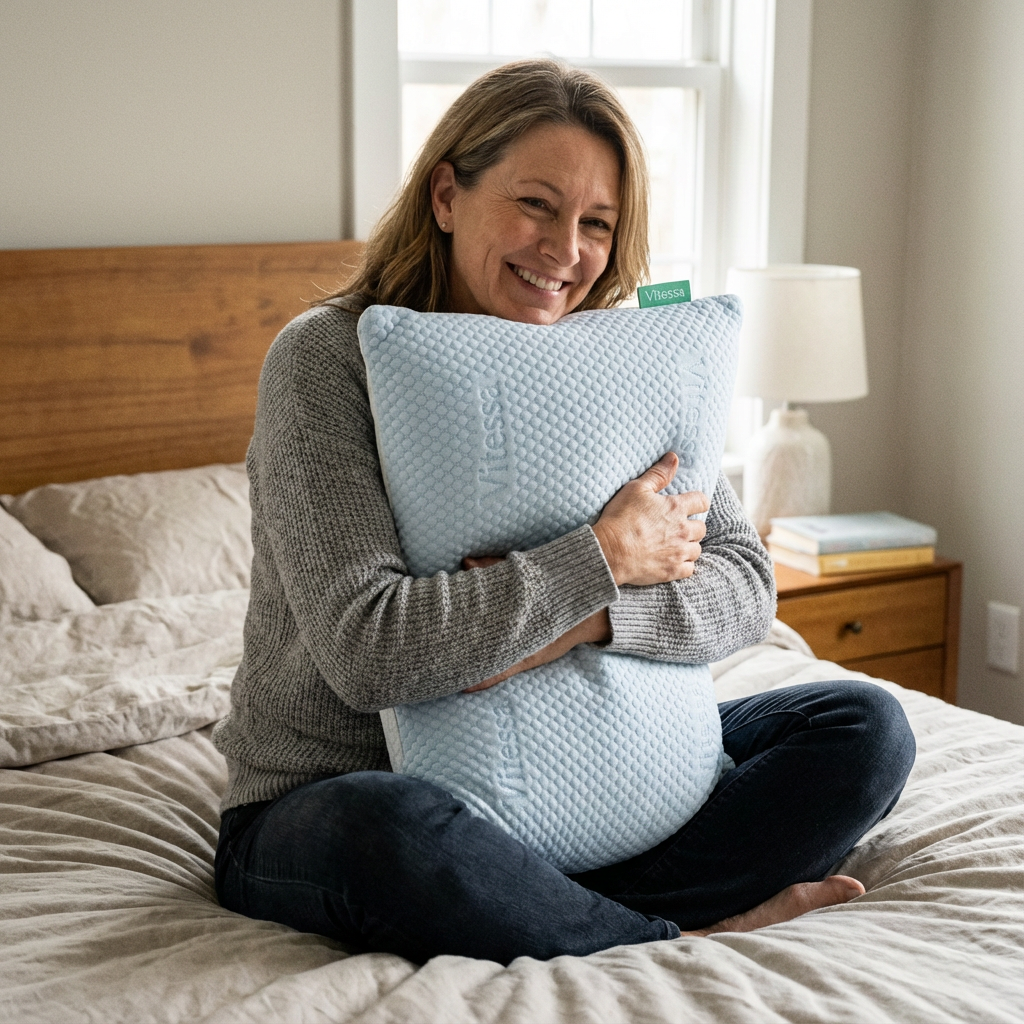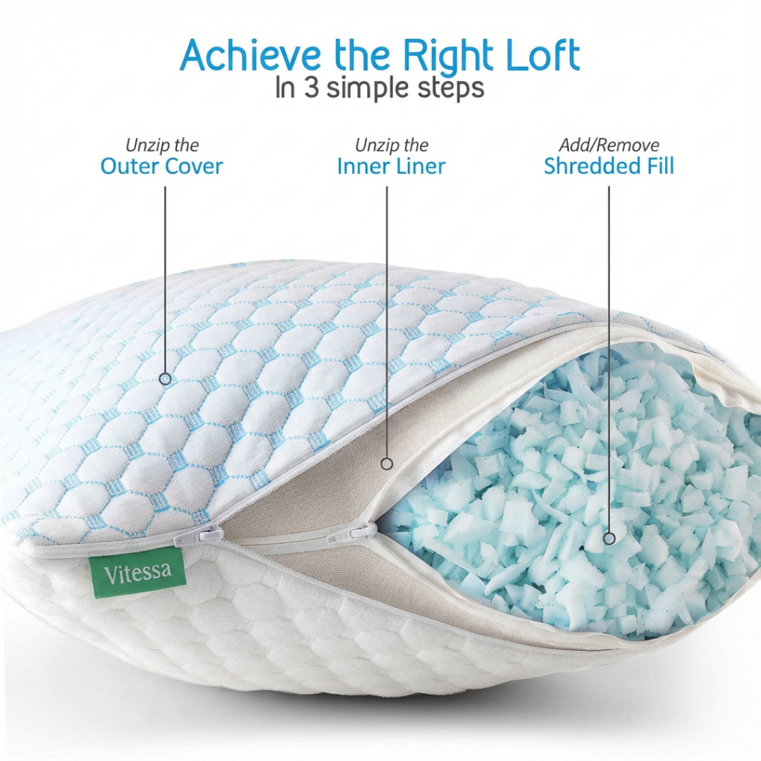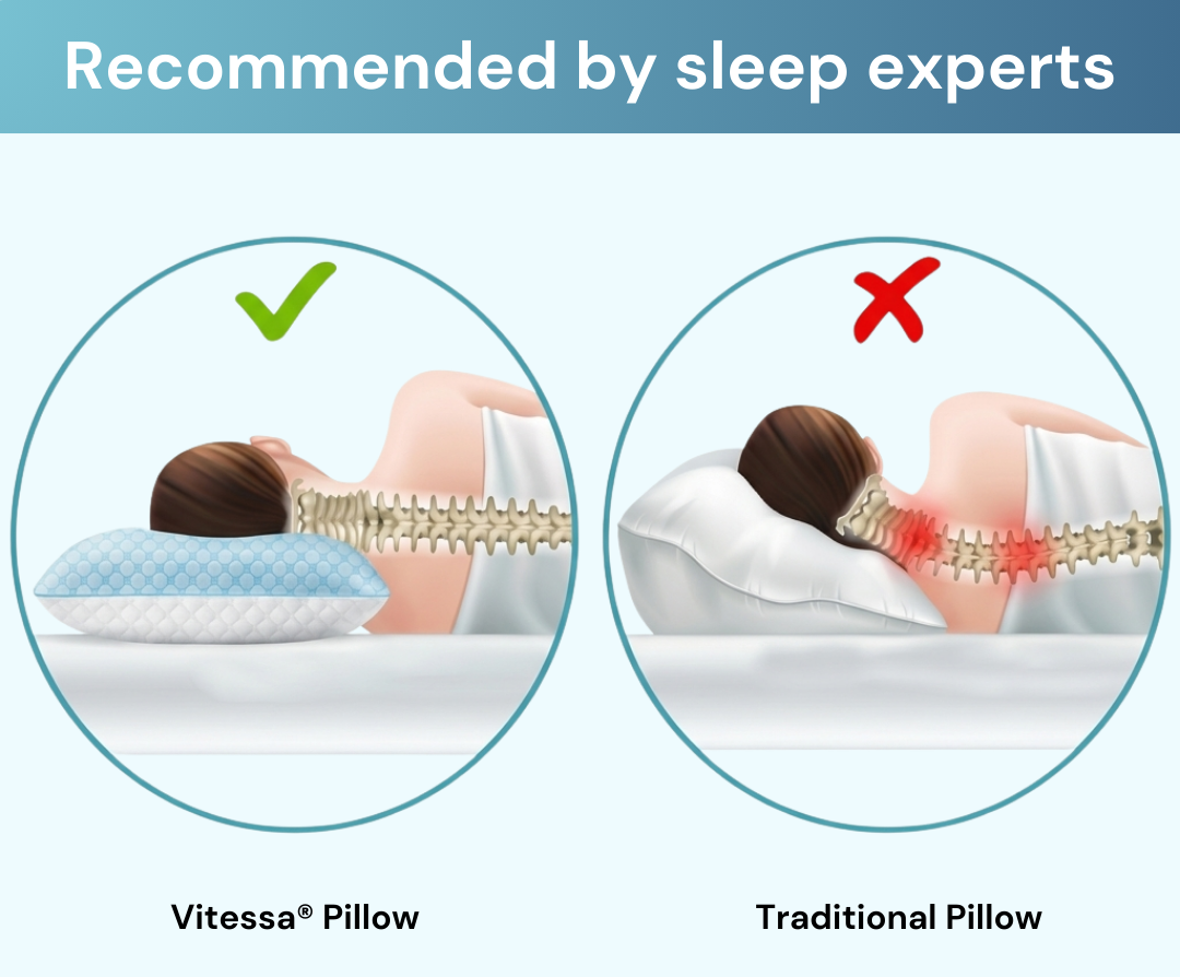 The Vitessa Pillow is made with premium memory foam. It adapts to your body while keeping your neck and spine properly aligned. Adjust it to your perfect height for pain-free sleep in any position!