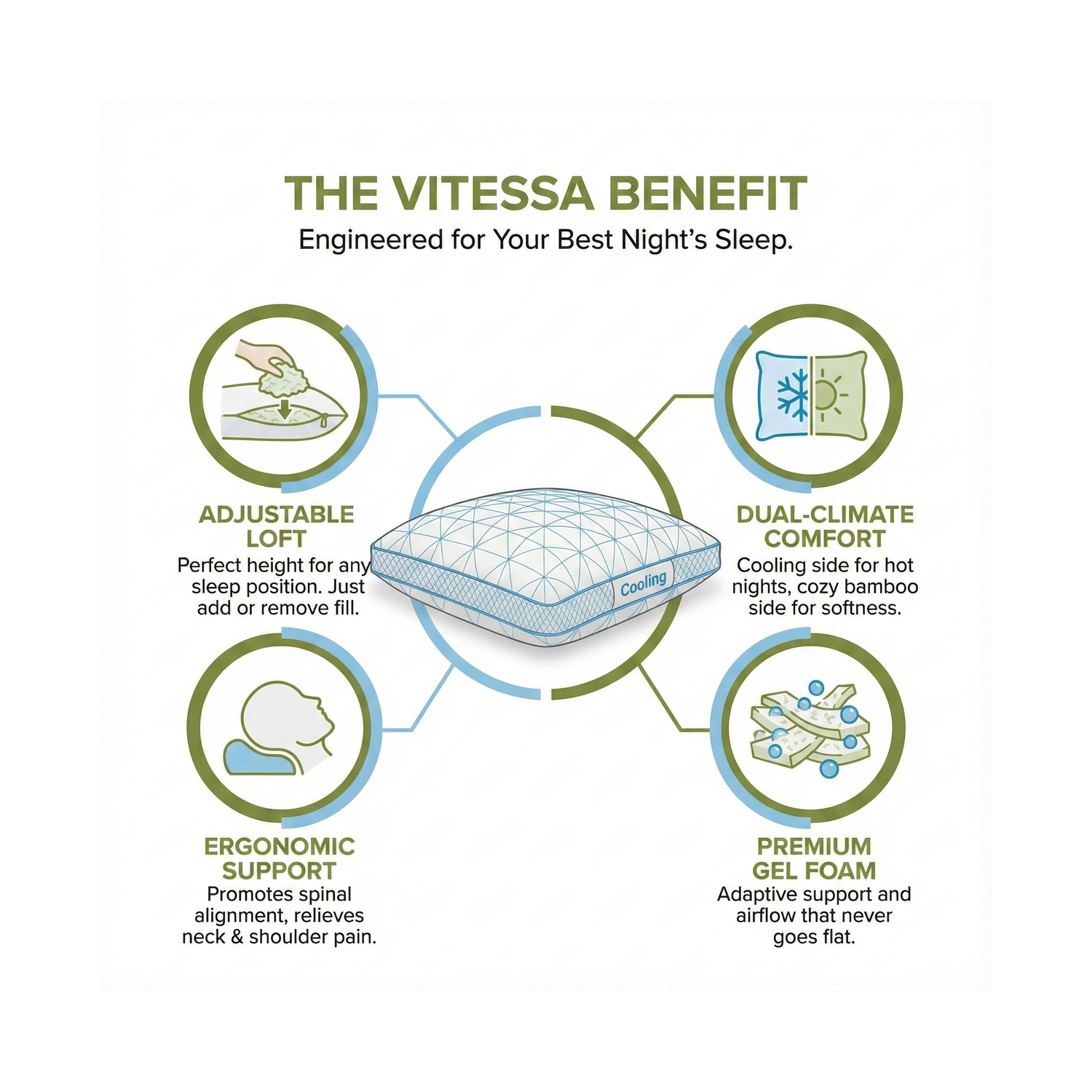 We designed Vitessa to be the only pillow you'll ever need, offering two distinct sleeping experiences. The Cooling side is ideal for hot sleepers, summer nights, or anyone experiencing night sweats. The Bamboo side (white stitching) offers a softer, naturally breathable, and hypoallergenic surface for a cozy, classic feel.